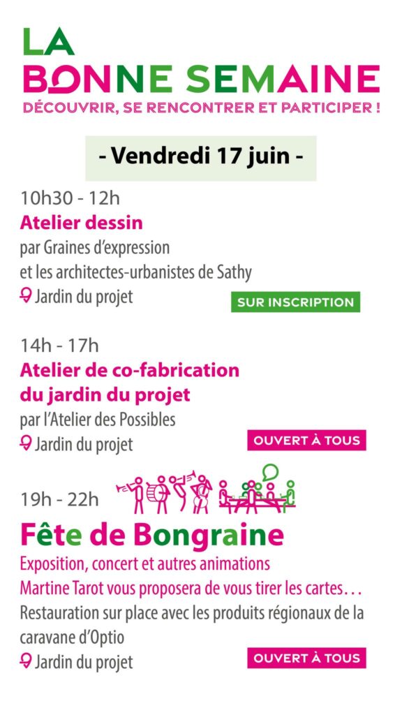 La Communauté d’Agglomération de La Rochelle, la Ville d’Aytré, avec la collaboration de la Ville de La Rochelle, l’aménageur Aquitanis et l’équipe de maitrise d’œuvre urbaine ont le plaisir de vous inviter à une semaine de rencontres, d’ateliers et de convivialité autour du projet d’Écoquartier de Bongraine, du 13 au 18 juin 2022.